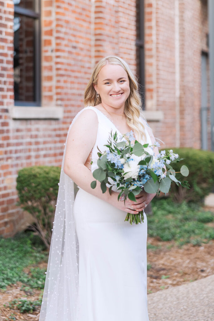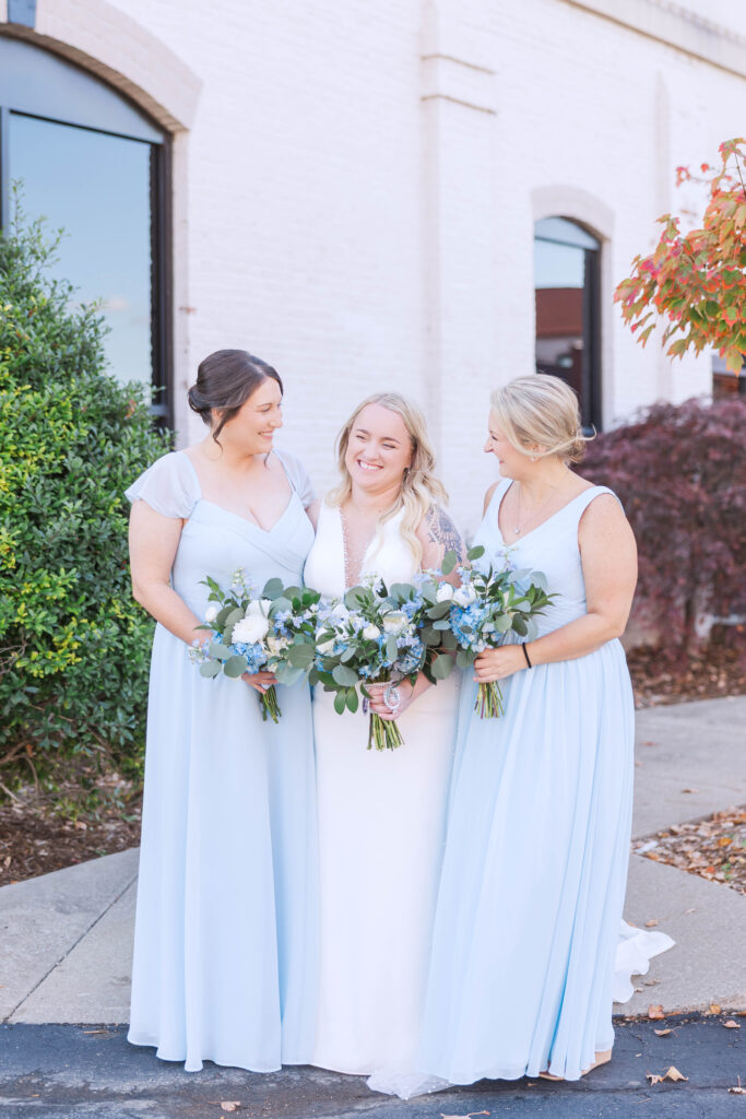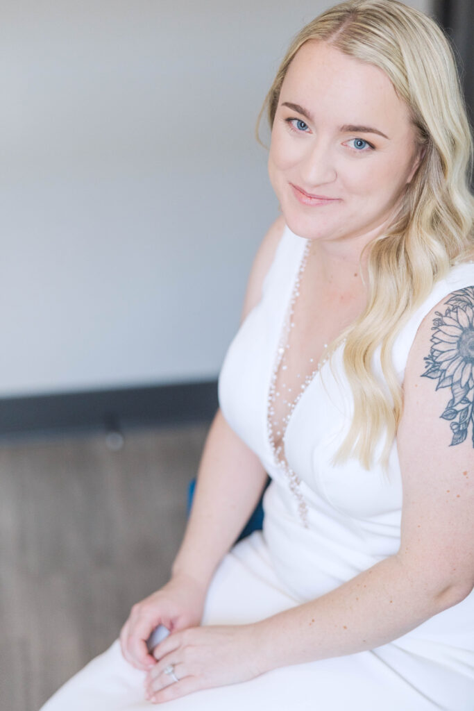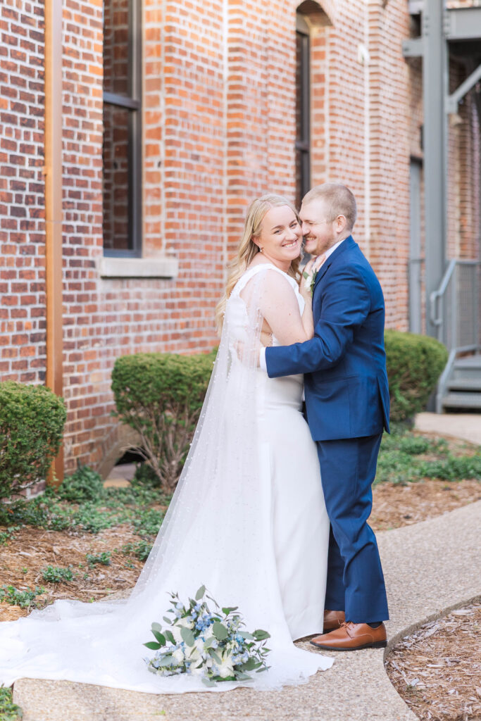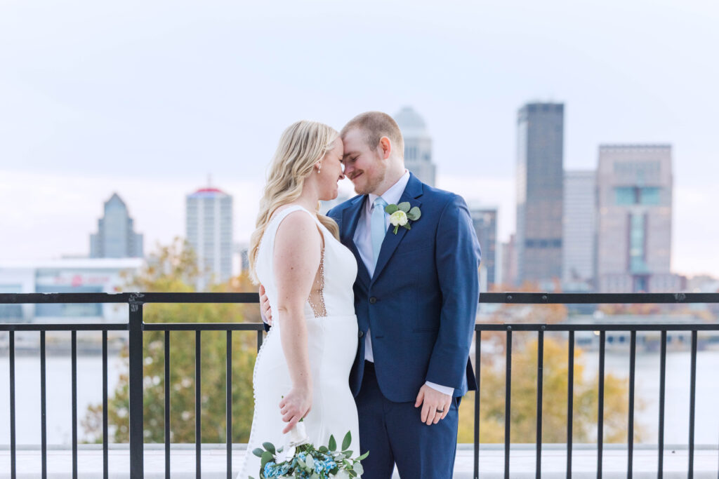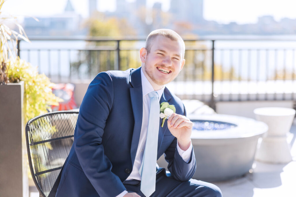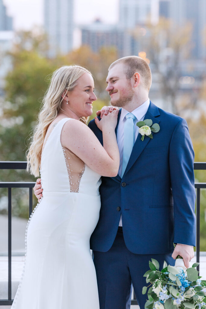 The Foundry itself was such a beautiful backdrop for their story. With its soft industrial touches and wide, open spaces, it gave their day a unique blend of warmth and modern charm. And just when I thought it couldn’t get better, we headed to the rooftop of Bolt and Tie for portraits — a lovely urban view with the city skyline stretching behind them. It felt like something out of a movie.